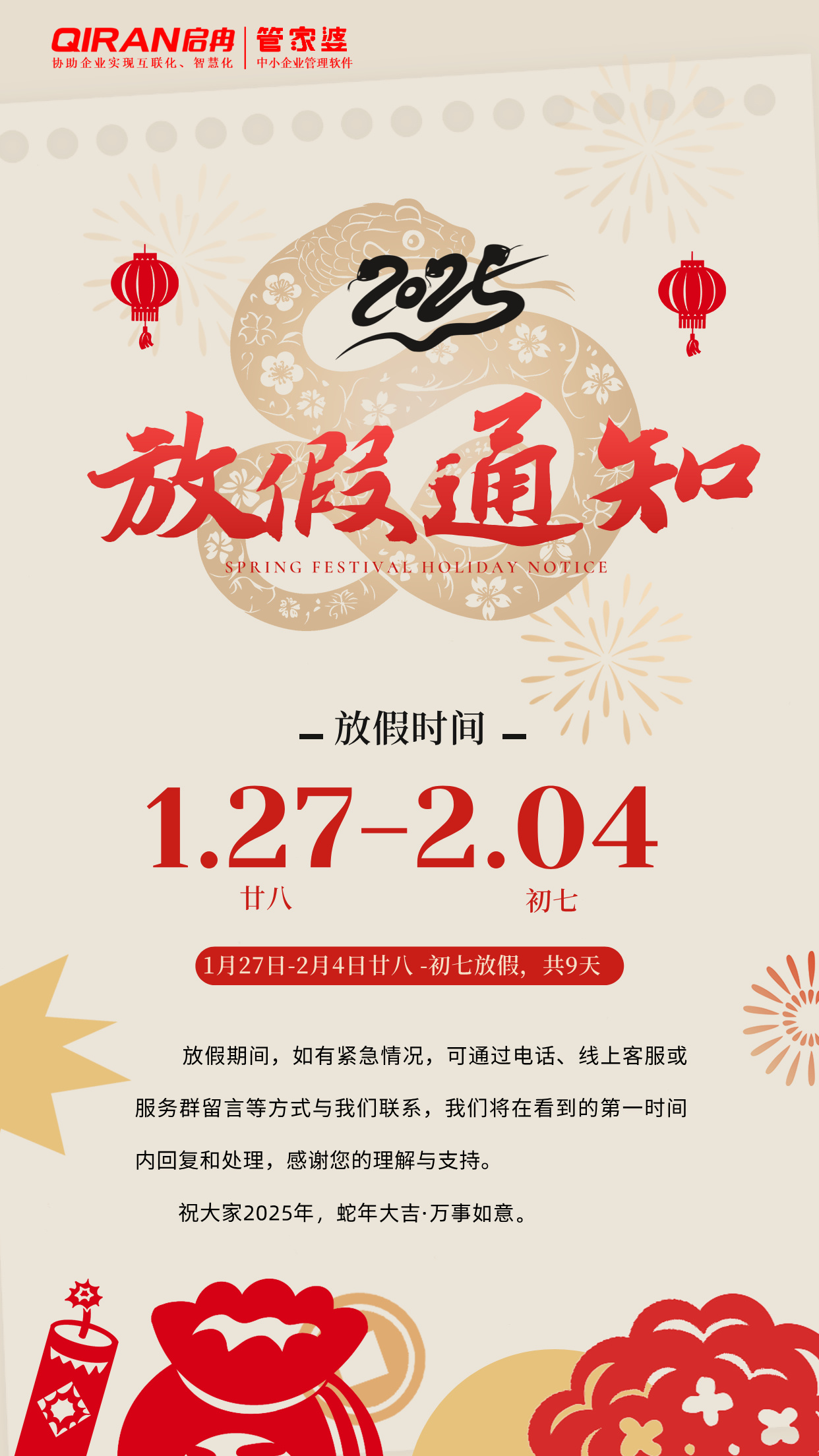 公告 | 啟冉軟件春節放假通知